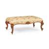 the padded seat upholstered in gold damask fabric, in a scrolling frame carved with scrolled cartouches, raised on foliate carved cabriole legs ending in ceramic casters