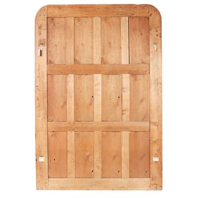 the mirror plate in an arch moulded frame with ribbon banding and a bead and reel inner slip, the base panel decorated with incised flowers