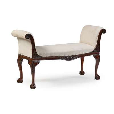 the bowfront padded seat and high scrolling ends in a carved frame, raised on cabriole legs ending in claw and ball feet