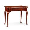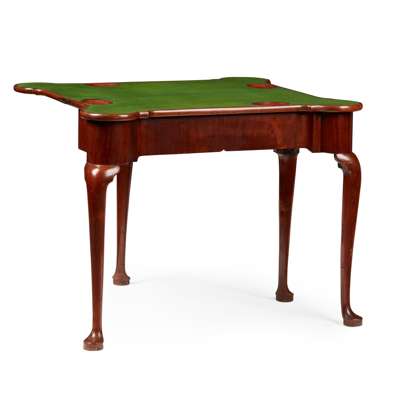 the fold-over top with outset rounded corners opening to a green baize lined playing surface with counter wells, above a plain frieze, with a single gate leg