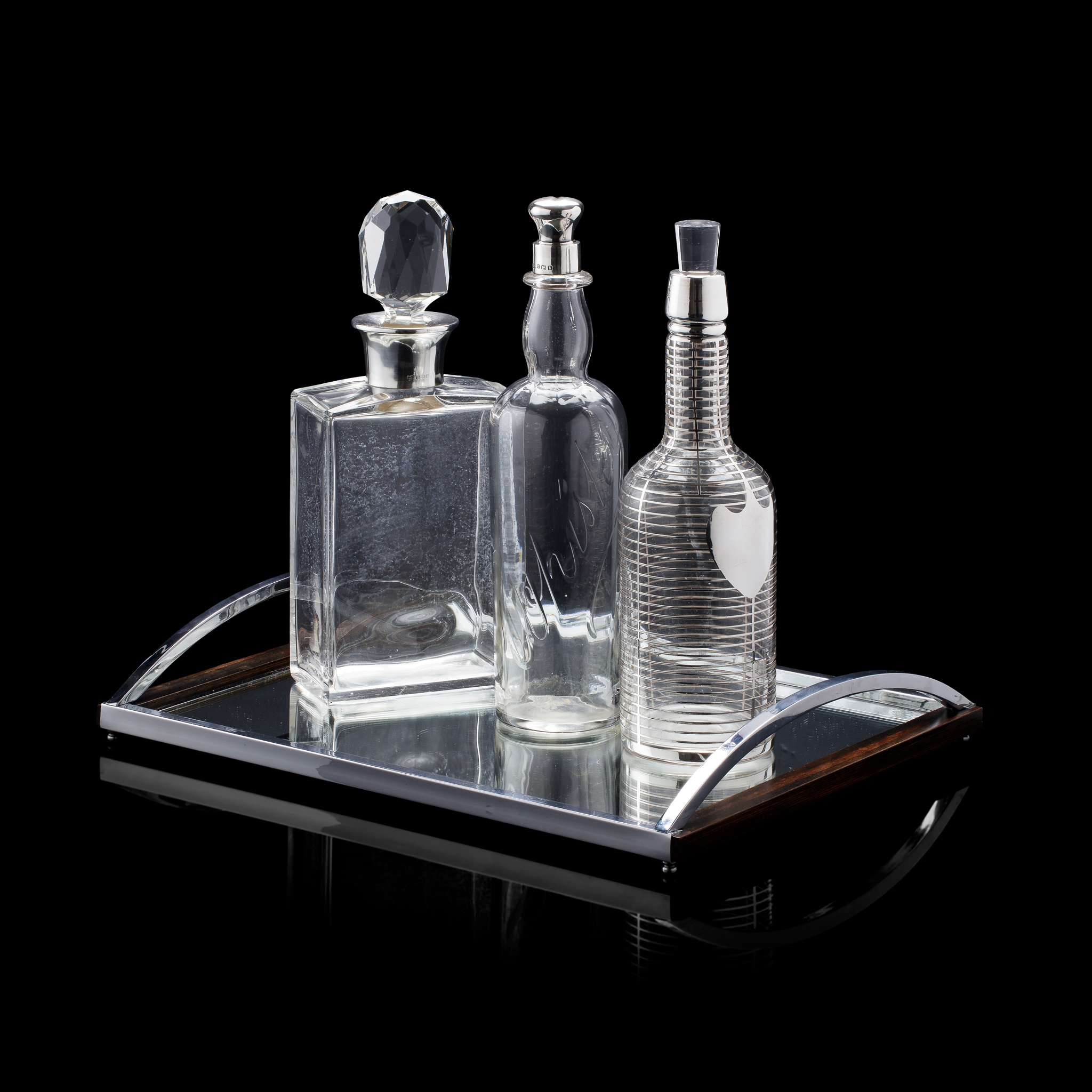 including a square plain decanter with facetted stopper and silver collar, hallmarked Birmingham 1933, Goldsmiths & Silversmiths Co Ltd; an American bottle decanter with pierced silver grill overlay and shield stamped 'Sterling'; and a facet moulded bottle decanter with silver collar engraved 'Whisky', hallmarked Birmingham 1907, Norton & White; and an associated Art Deco chromium mirrored tray mounted with demilune handles
