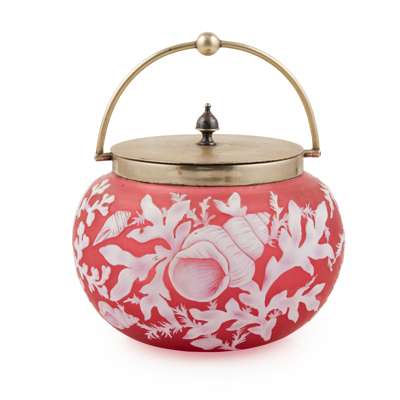 ENGLISH CAMEO GLASS SILVER-PLATE MOUNTED BISCUIT BARREL, IN THE MANNER OF THOMAS WEBB