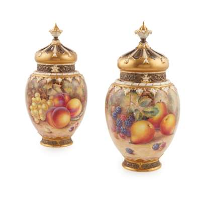 PAIR OF LARGE ROYAL WORCESTER FRUIT PAINTED POT POURRI JARS WITH COVERS AND LINERS