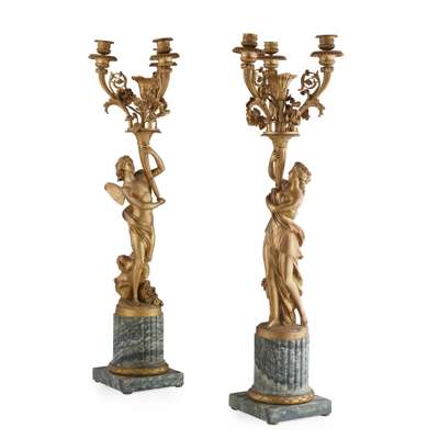 PAIR OF FRENCH GILT BRONZE AND GREY MARBLE FIGURAL CANDELABRA