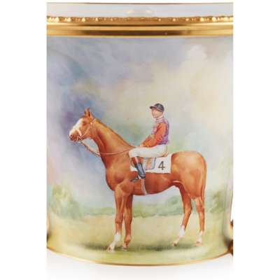 painted to one side with a jockey on horseback, and the reverse with a mare and foal; inscribed to the base 'Oceania' (Aureole ex Ocean) and 'Danny La Rue' (Sharpen Up ex Oceania), and 'Aureole' dated 1978; raised on a green enamel socle base with a gilt moulded rim; the domed cover with a gilt finial handle; printed factory mark