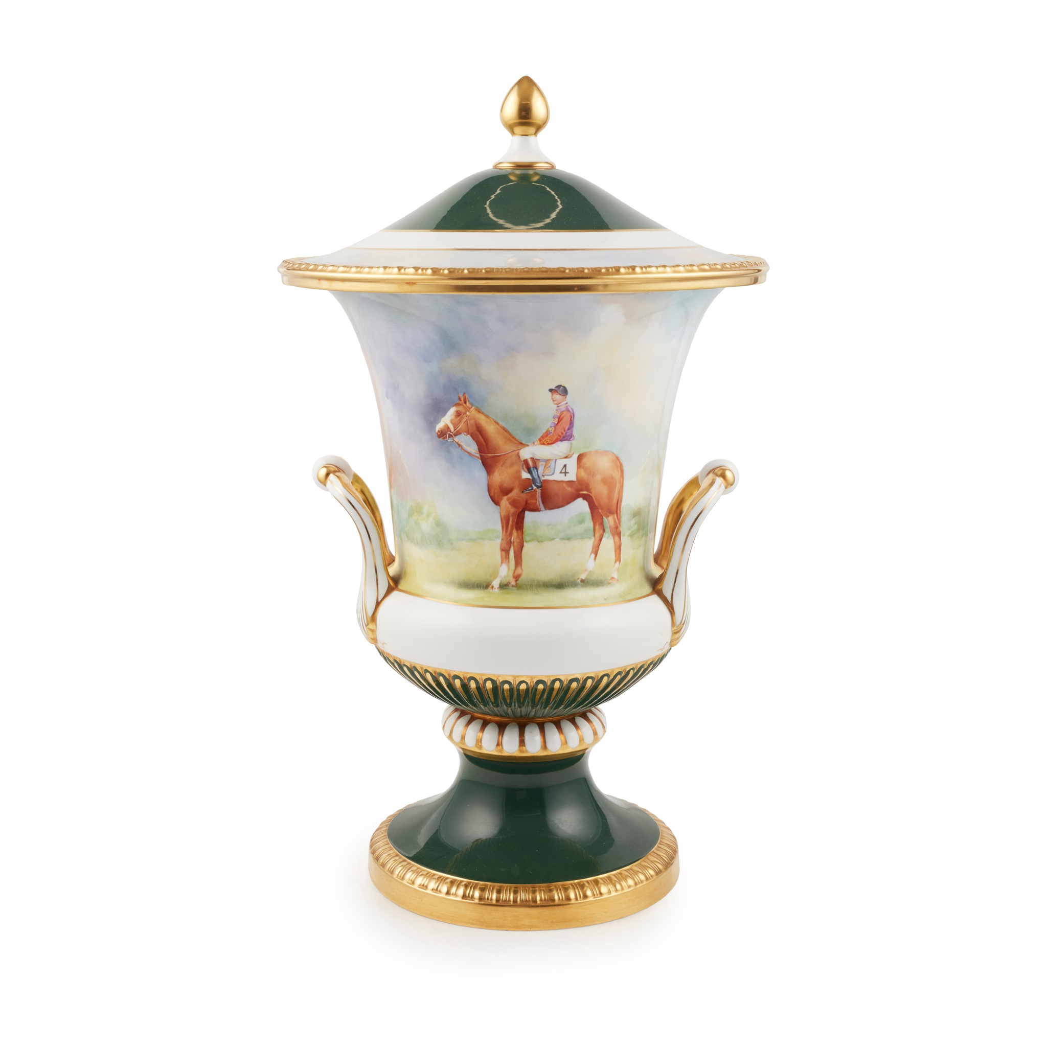 LARGE CAVERSWALL TWIN-HANDLED CAMPAGNA URN AND COVER, PAINTED BY R.A SHUFFLEBOTTOM, OF RACING INTEREST