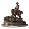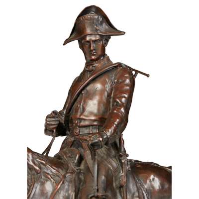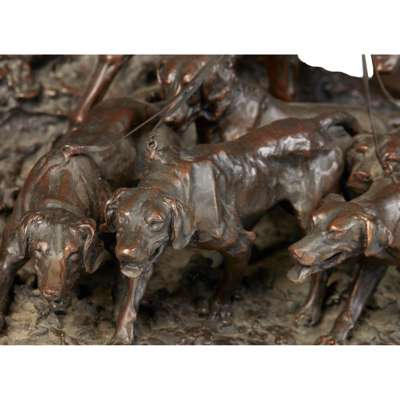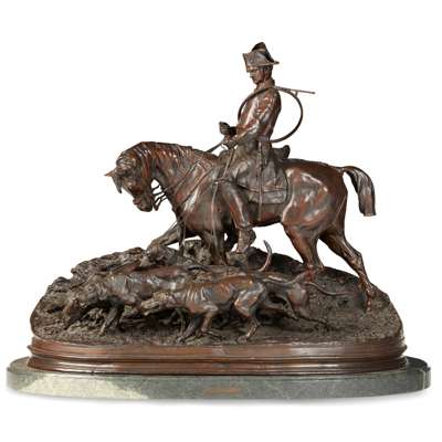 bronze, dark brown patina, large format modelled with a French hunter on horseback leading five hounds on a naturalistic oval base, signed 'P J Mêne 1869', on an oval green marble plinth