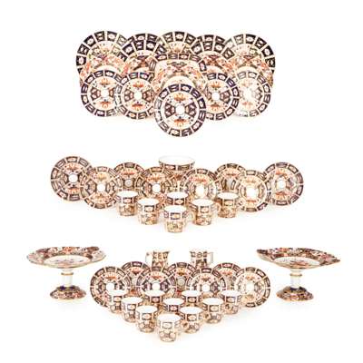 comprising seven dinner plates, 27cm diameter; five larger side plates, 18.5cm diameter; three small side plates, 12.5cm diameter; eighteen various saucers; eighteen various cups; two cream jugs; sugar bowl; square cake plate; three further large saucers; together with a DESSERT SERVICE, pattern 6217, comprising two tall comports, 25cm wide, 12cm high and six dessert plates; all in the Imari palette enriched with gilding, various factory marks
