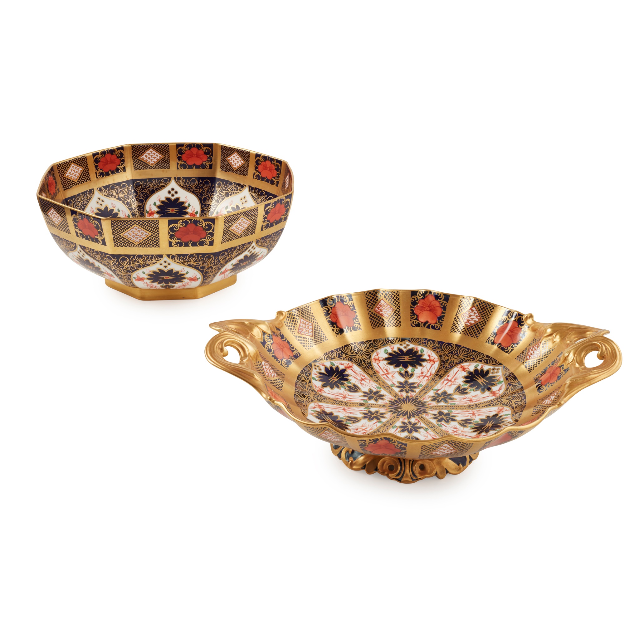 the comport of circular form with a fluted and scalloped rim and twin open handles, raised on a pierced scroll foot; the bowl of octagonal form; pattern 1128; both in the Imari palette enriched with gilding, red printed factory marks