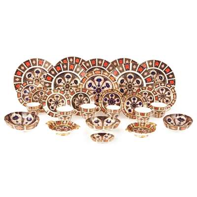 mostly pattern 1128 with slight variation; comprising seventeen dinner plates; sixteen side plates; two scalloped rim bon bon dishes; two round cake plates and one square cake plate; teapot; two various cream jugs; sugar basin; tea strainer; seventeen various teacups; twenty-one various saucers; four graduated fluted oval dishes; and one small round dish; in the Imari palette enriched with gilding, various factory marks