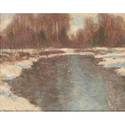 A WOODED RIVER LANDSCAPE, WINTER