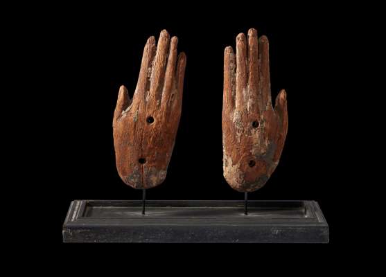 ANCIENT EGYPTIAN WOODEN HANDS FROM AN ANTHROPOID SARCOPHAGUS