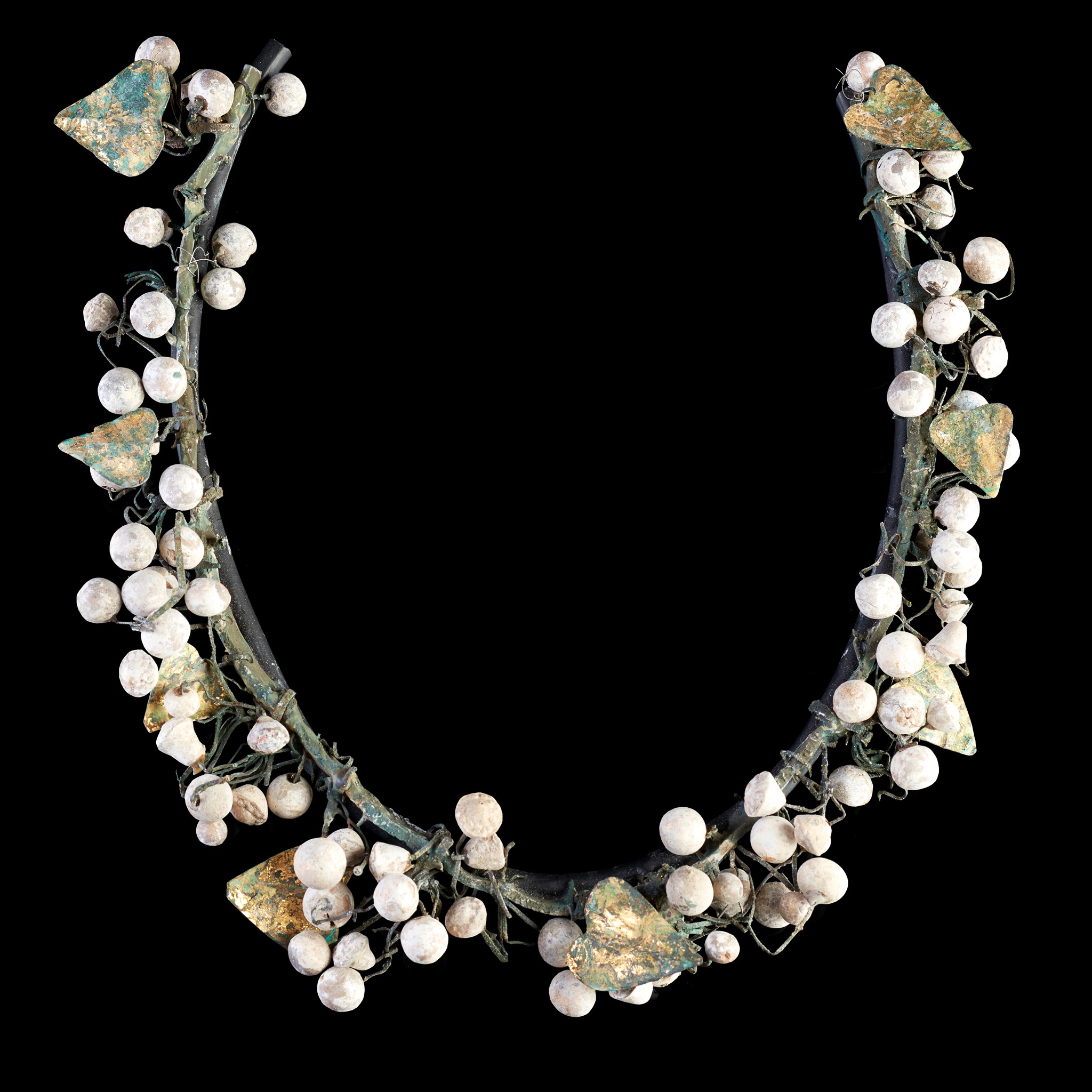 bronze wire, adorned with gilded traces on the bronze ivy leaves, among them are delicate bronze strands securing white terracotta berries painted with white gesso