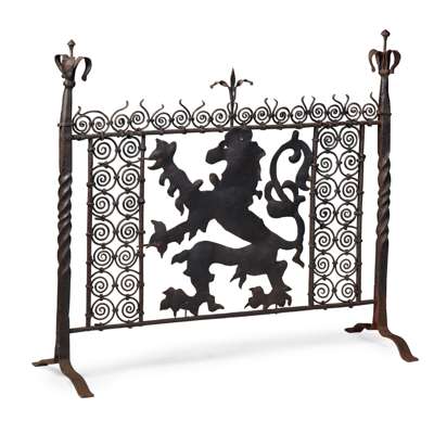 with a lion passant flanked by filigree panels and spiral turned supports with fleur-de-lis finials and trestle bases