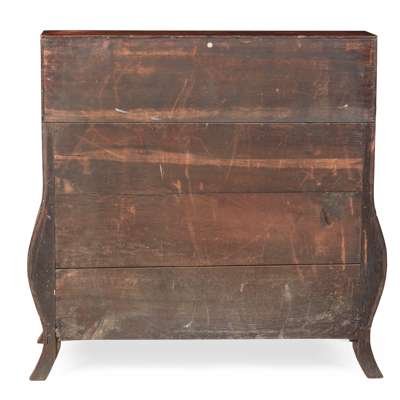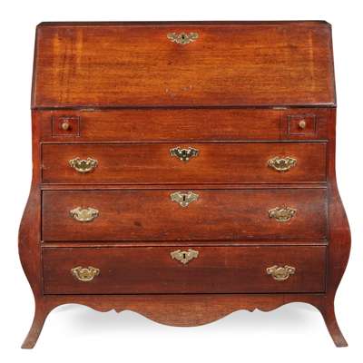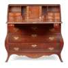 the slope front opening to an arrangement of pigeon holes, drawers and hidden compartments, with a covered well recess, over a pair of lopers and three long bombé drawers, raised on splayed feet