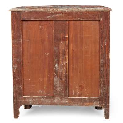 FRENCH TRANSITIONAL STYLE KINGWOOD, PARQUETRY, AND PARCEL GILT MARBLE TOPPED COMMODE