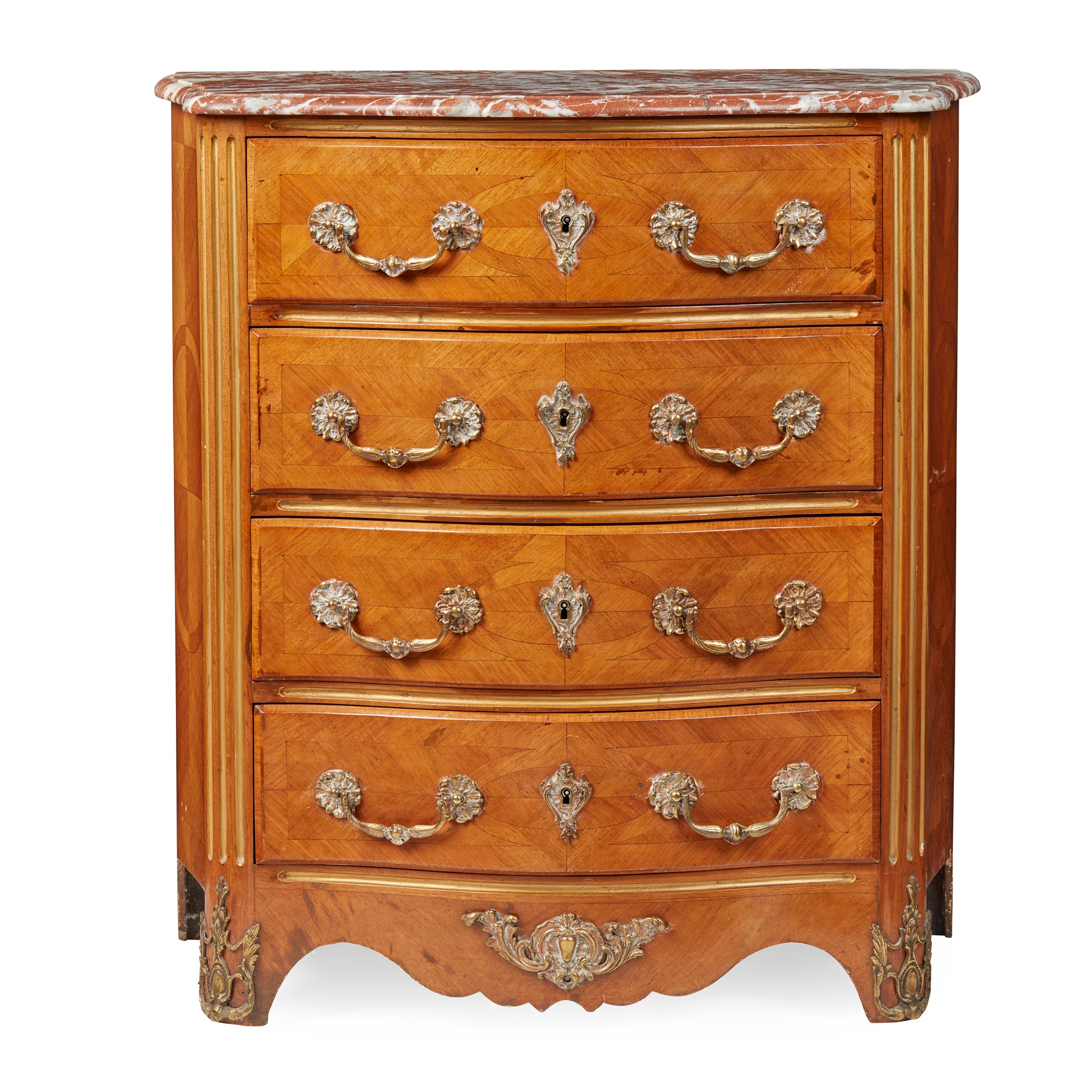 the serpentine rouge marble top with a moulded edge, above four serpentine drawers flanked by fluted angles, on a shaped apron and raised on bracket feet with gilt bronze mounts