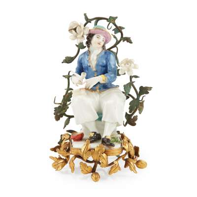 modelled by J.F. Eberlein, wearing a purple lined green hat, his blue jacket with gilt trim, seated on a green cushion with gilt tassels, a pipe in his right hand and a bag of tobacco on his knee, a berry pot by his feet, the base applied with a leaf and flower, faint blue crossed swords to base, 13.5cm high, enclosed within a gilt metal stand issuing leafy gourds as feet and with green and gilt branches issuing porcelain flowers, the stand stamped with a crowned C mark