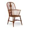 the hooped back and curved arms enclosing a pierced draught splat and spindles, above a moulded seat raised on turned and tapered legs joined by an H-stretcher, the back of the seat stamped 'T.A'
