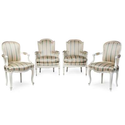 TWO PAIRS OF IVORY PAINTED FRENCH ARMCHAIRS