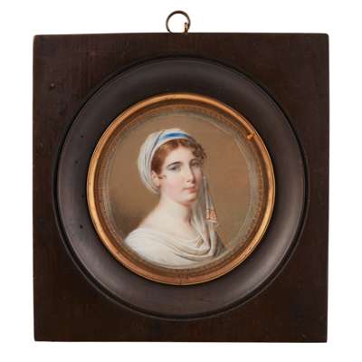 circular, watercolour and body colour on vellum, the sitter a young woman with auburn hair and blue eyes wearing a draped gown and head covering with blue ribbon and red embroidered details