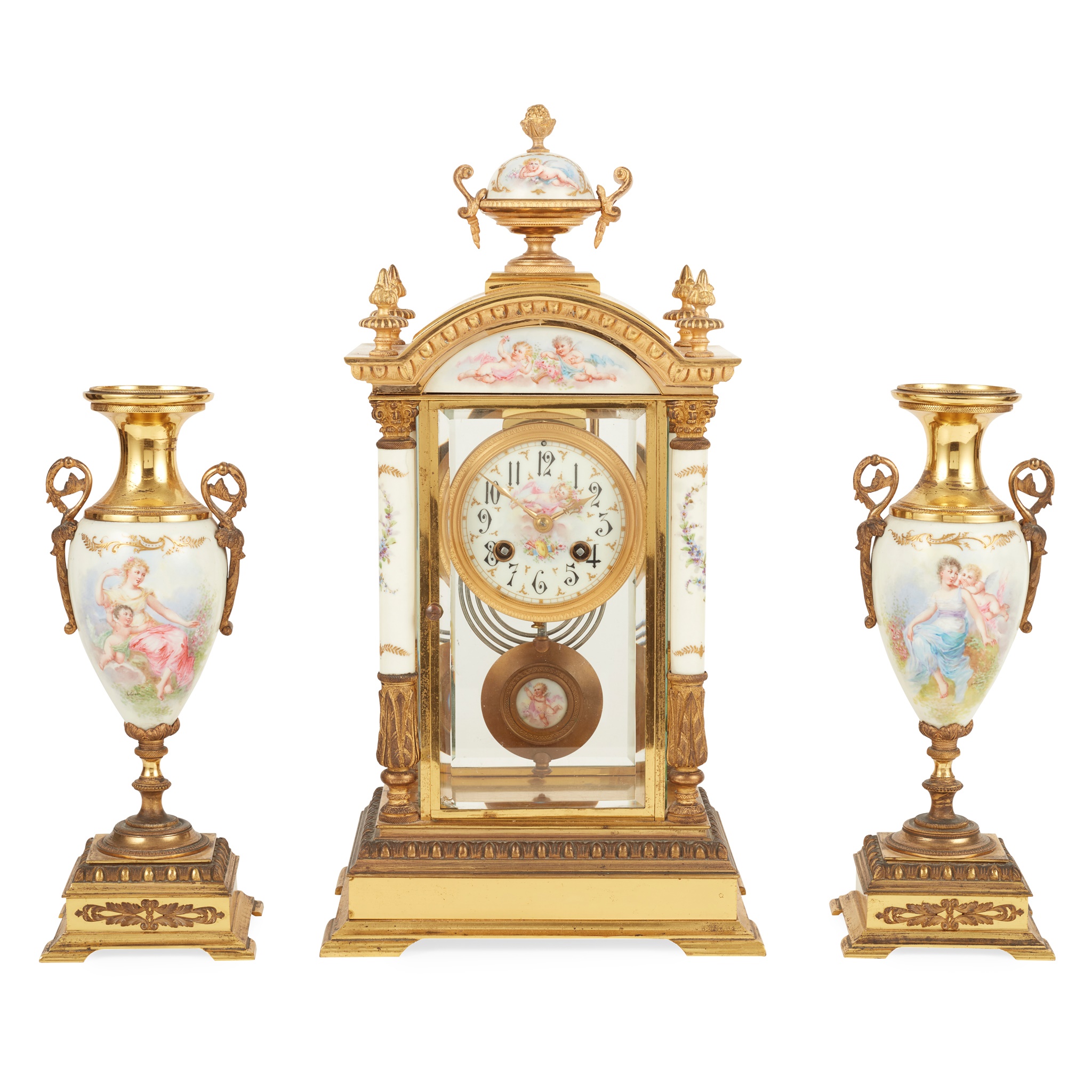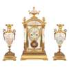 FRENCH GILT BRONZE AND PORCELAIN THREE PIECE CLOCK GARNITURE
