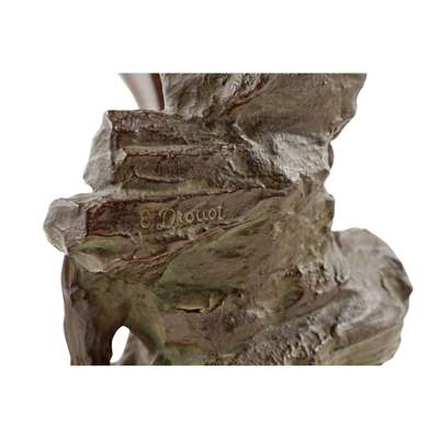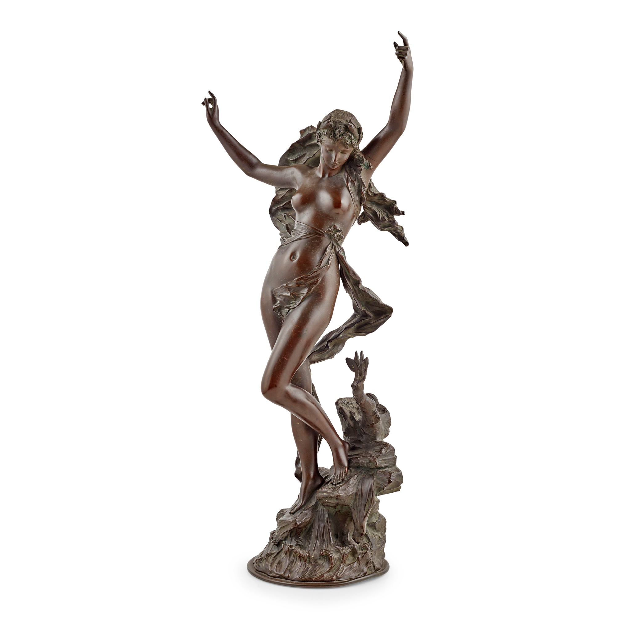 bronze, dark brown patina, modelled as a draped nymph with arms outstretched on a watery rocky outcrop, signed ‘E. Drouot’