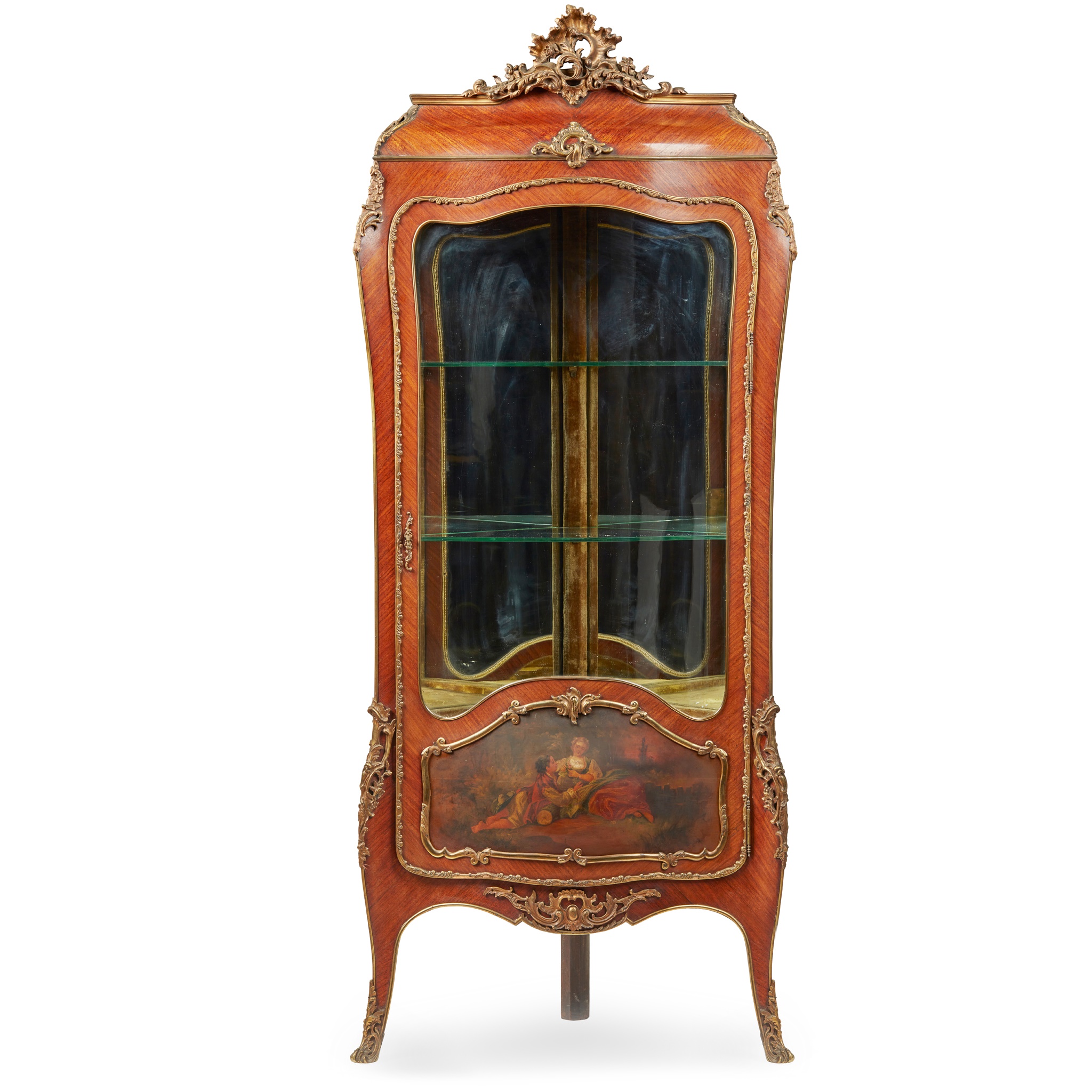 the ogee shaped cornice with a gilt metal rococo finial, above a glazed bombé door with a Vernis Martin panel below, opening to glass shelves and a mirror back, all outlined in gilt metal mounts and raised on splay legs with sabots