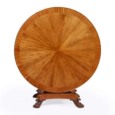 the crossbanded circular tilt top banded in brass with radial veneers, on a square baluster column and concave quadripartite platform raised on carved claw feet with brass castors