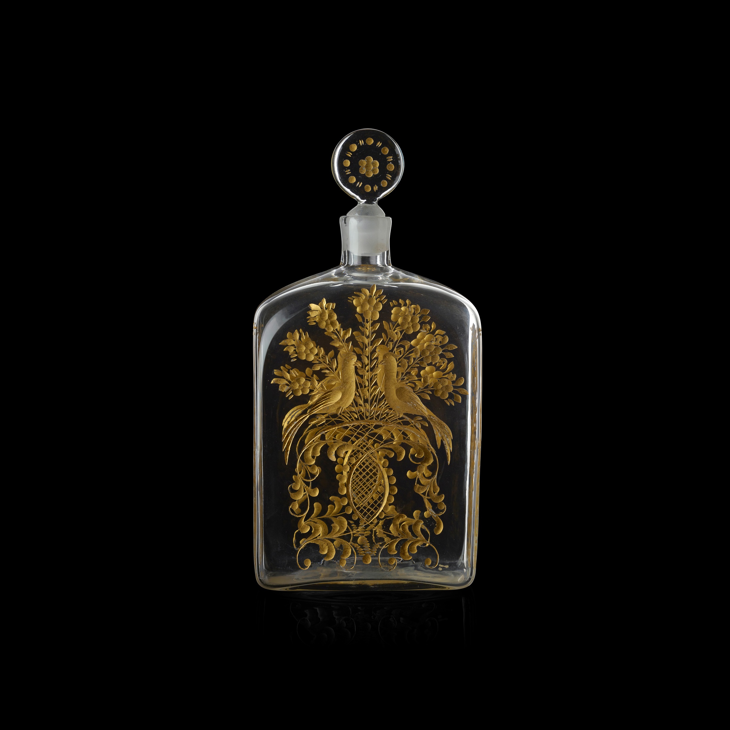 of rectangular section with a bull's eye stopper, the body with engraved and gilt decoration to each side depicting a pair of birds perching amongst flowering stems, above scrolling foliate and diaper decoration, the side panels with further scrolling and floral designs, the stopper with stylised flowerhead and dot and line motifs
