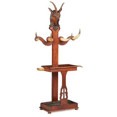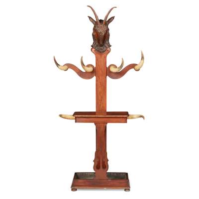 the centre support surmounted by a carved goat's head with horns, over twin scrolling arms with cow horn hat/coats hooks above a shelf fitted with horns for holding sticks, a drop pan below