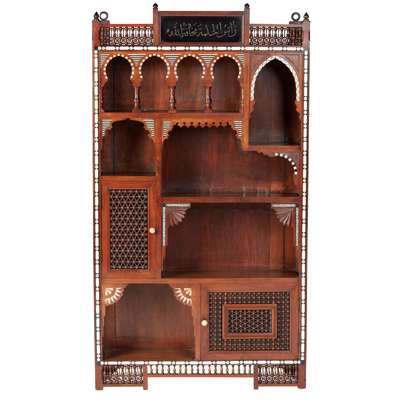 comprising an arrangement of finely made arched recesses, shelves and cupboards, with geometric inlay throughout and the cornice centred with an Islamic text panel, translated 'The Height of Wisdom'