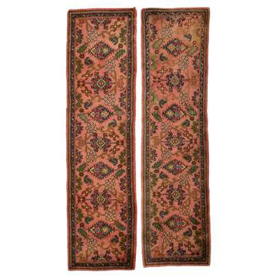 each with pink field with serrated lozenge and stylised vine pattern, within narrow indigo border