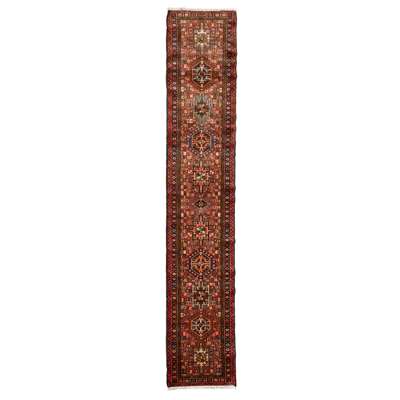 the reddish brown field with column of medallions, within narrow indigo border