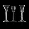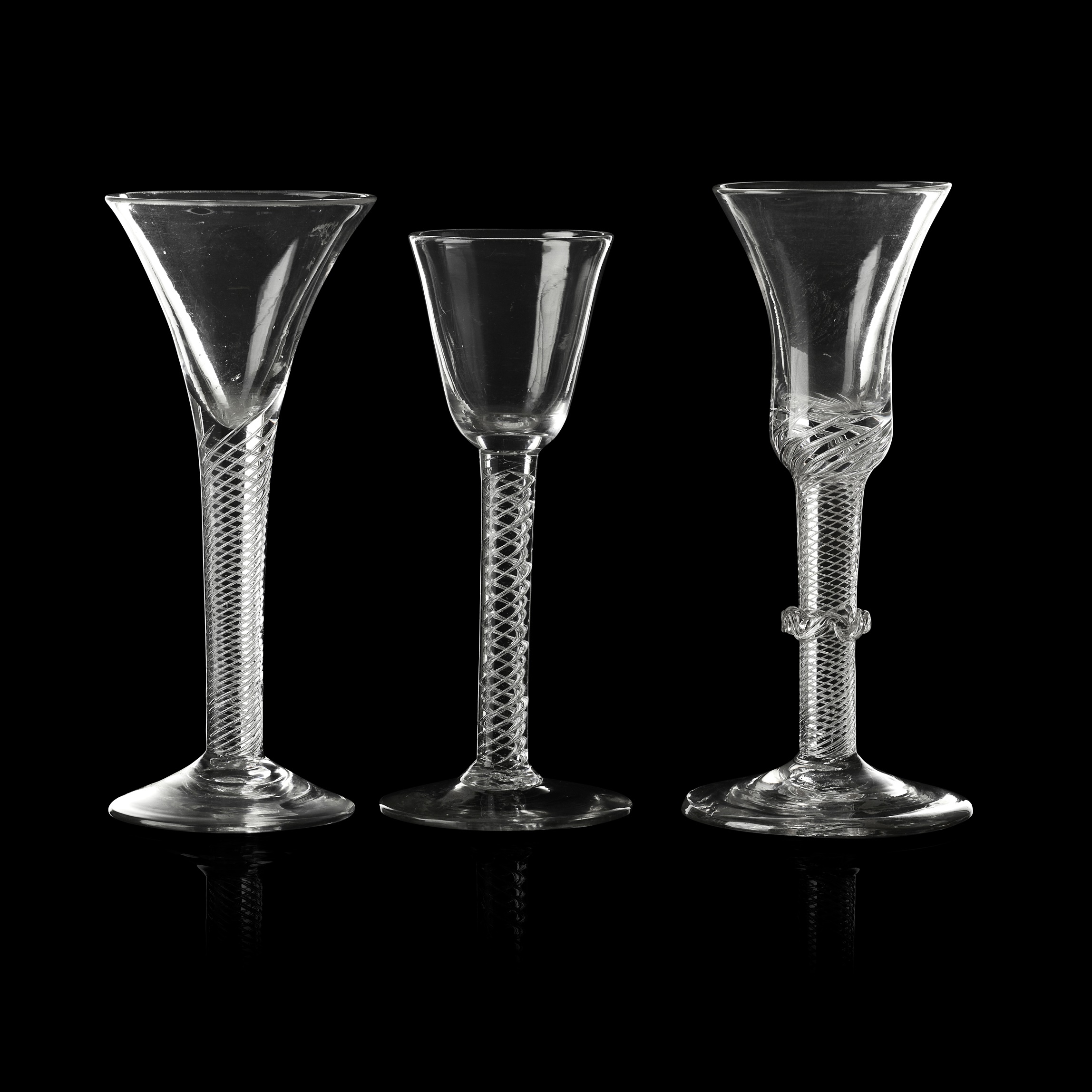 one with a drawn trumpet bowl, 16cm high; one with a round funnel bowl, 15.1cm high; one with a bell-shaped bowl on a multi-spiral stem with a vermicular collar, the threads of air extending into the solid base of the glass
