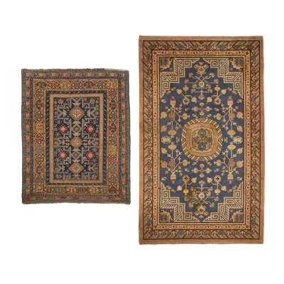 the blue field with circular floral medallion, Greek key spandrels, within polychrome border; and a LESGHI RUG, the indigo field with three star medallions, within yellow border