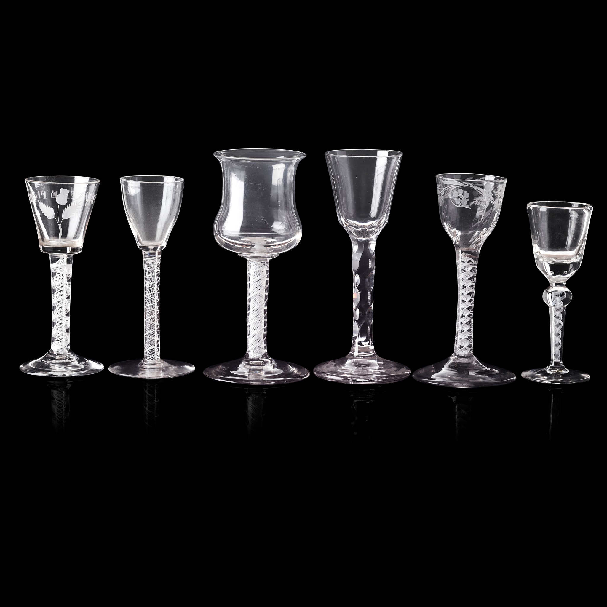 comprising an opaque twist glass with a bucket bowl engraved with a thistle and 'Speed the Plough, 13.8cm high; an opaque twist glass with a wrythen fluted ogee bowl engraved with a band of flowers, 14.5cm high; an opaque twist glass with a large tulip shaped bowl, 15.9cm high; a facet stem glass with a round funnel bowl, 16.3cm high; together with TWO 20TH CENTURY OPAQUE TWIST CORDIAL GLASSES