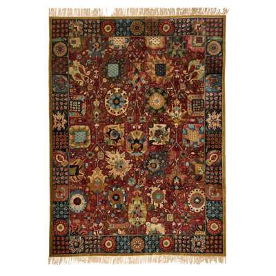 the brick red field with allover stylised palmette pattern, within slate grey border