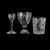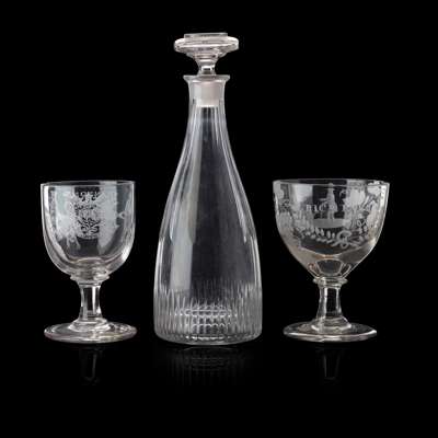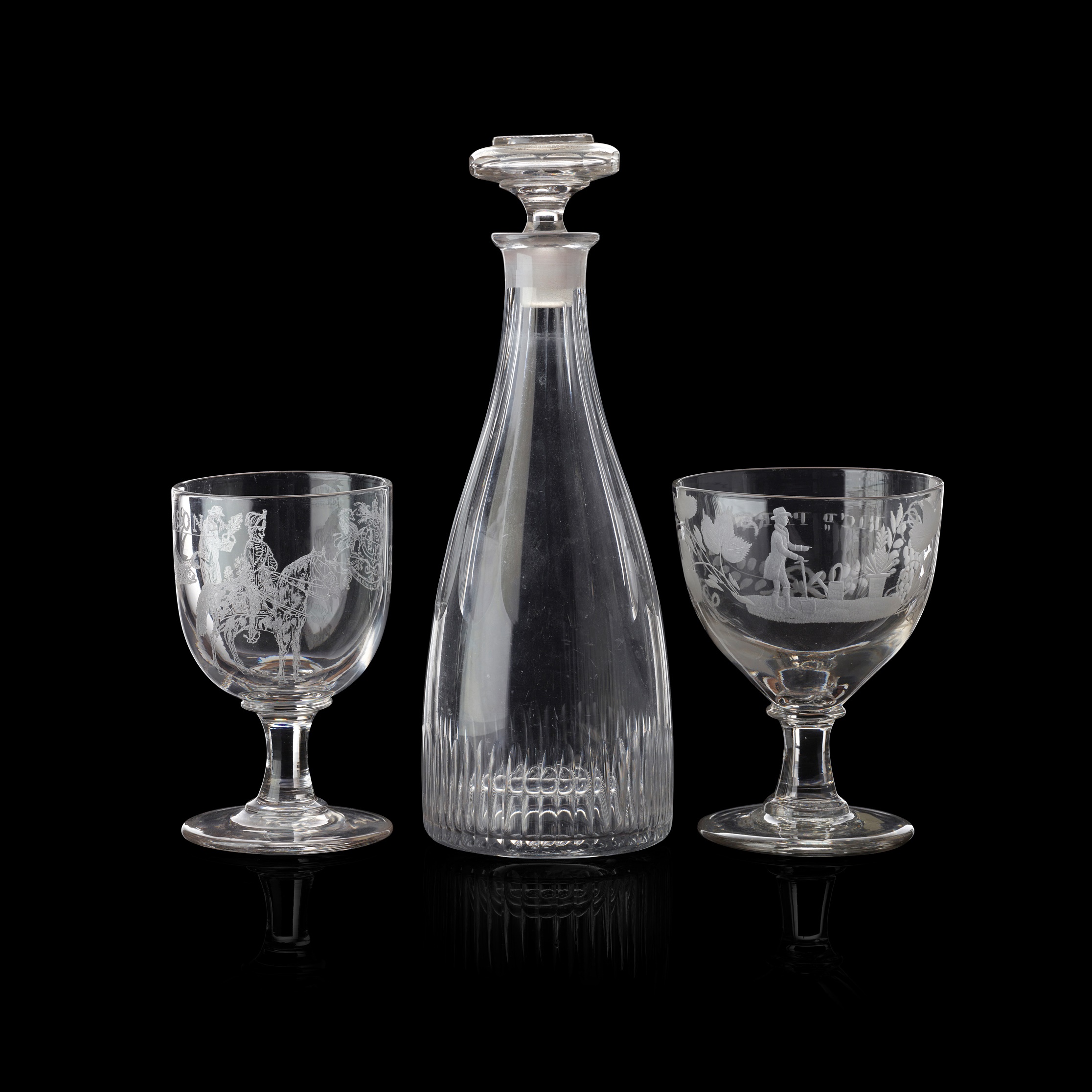 comprising three engraved rummers, one engraved with a scene depicting a gardener growing a pineapple, inscribed 'Ricd Parr', 13.7cm high; one engraved with a bird in flight and a spray of flowers with the initials 'R.M', on a square section foot, 13.7cm high; one engraved with a coat of arms, a soldier on horseback, a man tending plants in pots and a fish, inscribed 'Ranson's', 13.5cm high; one a tumbler engraved with stems of flowers and foliage and inscribed with the initials 'E J C Born / March 4 1853 /Died / May 29 1836', with a star cut base, 10cm high; a Dutch cordial glass, the ogee bowl engraved with flowers, on a plain stem and folding foot, 12.7cm high; and a decanter with flat topped stopper, the neck cut with facets and the lower body cut with a band of flutes, 17.5cm high