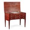 the hinged top with a moulded edge opening to an arrangement of compartments and a ratchet-adjusted mirror with a bevelled plate; above a dummy frieze drawers and deep drawer flanked by four short drawers, raised on square tapered legs
