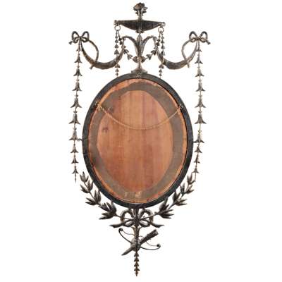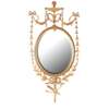 in the Neoclassical taste, the oval bevelled mirror plate within a ribbon carved frame, surmounted by flowering urn and drapery swags with trailing husks, a pendant ribbon tied bow and quiver below