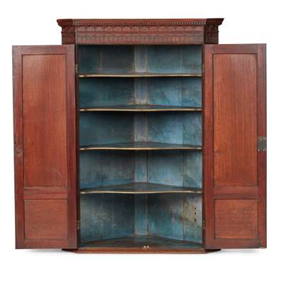 the blind-fret carved and dentil moulded frieze above a pair of panel moulded doors flanked by fluted angles and opening to a blue painted shelved interior