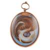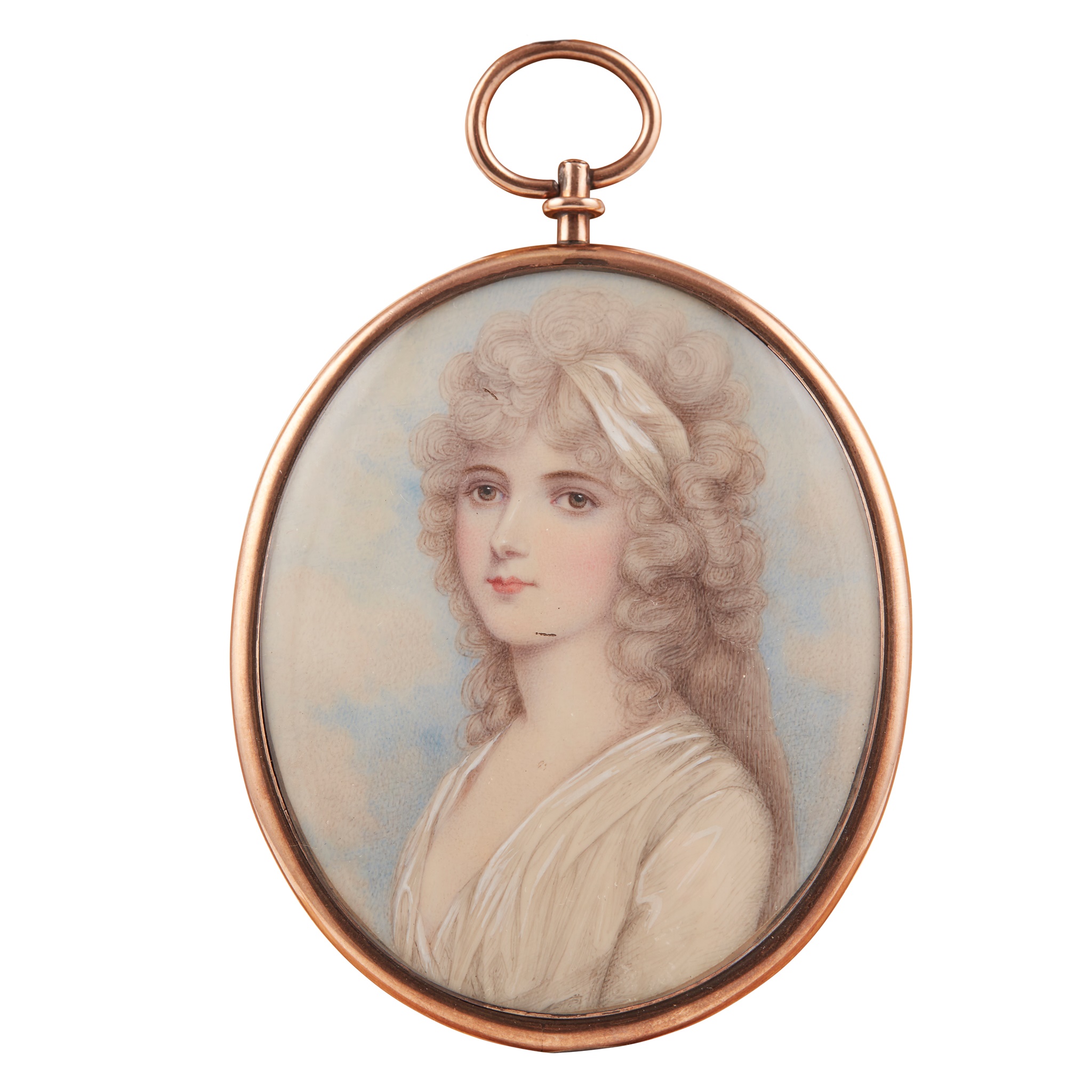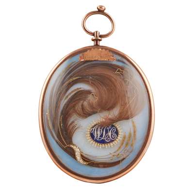 oval, painted in watercolour and body on ivory, the sitter a young lady with grey loosely curled hair and white bandeau, wearing a white chemise dress, the reverse with a lock of hair set as a wheat sheaf with gold thread, with a blue enamel reserve mounted with seed pearls and monogram 'WDC', on an opalescent enamel ground, in an unmarked yellow metal pendant frame with suspension loop