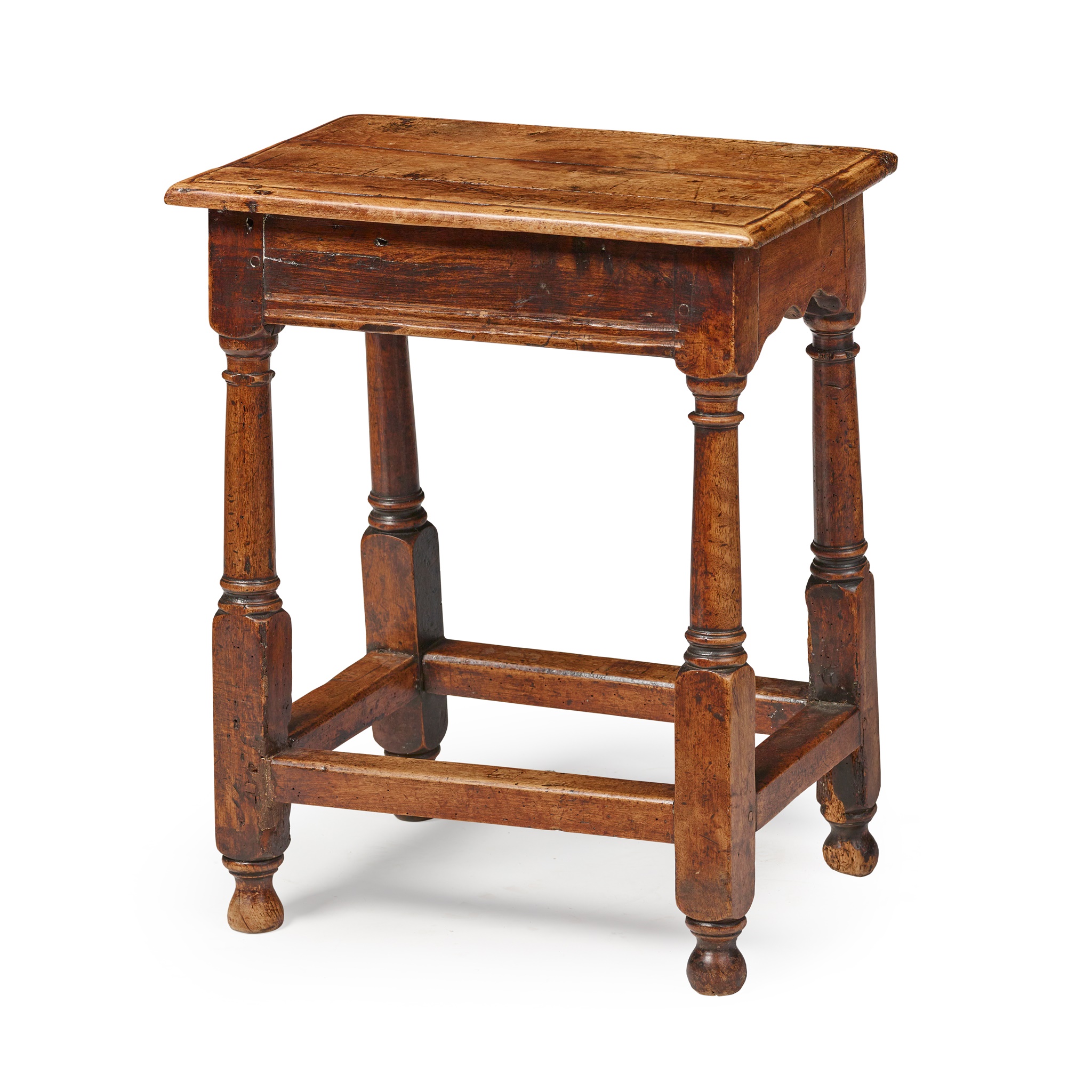 the rectangular top over a plain frieze raised on turned legs united by squared peripheral stretchers