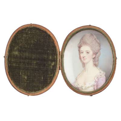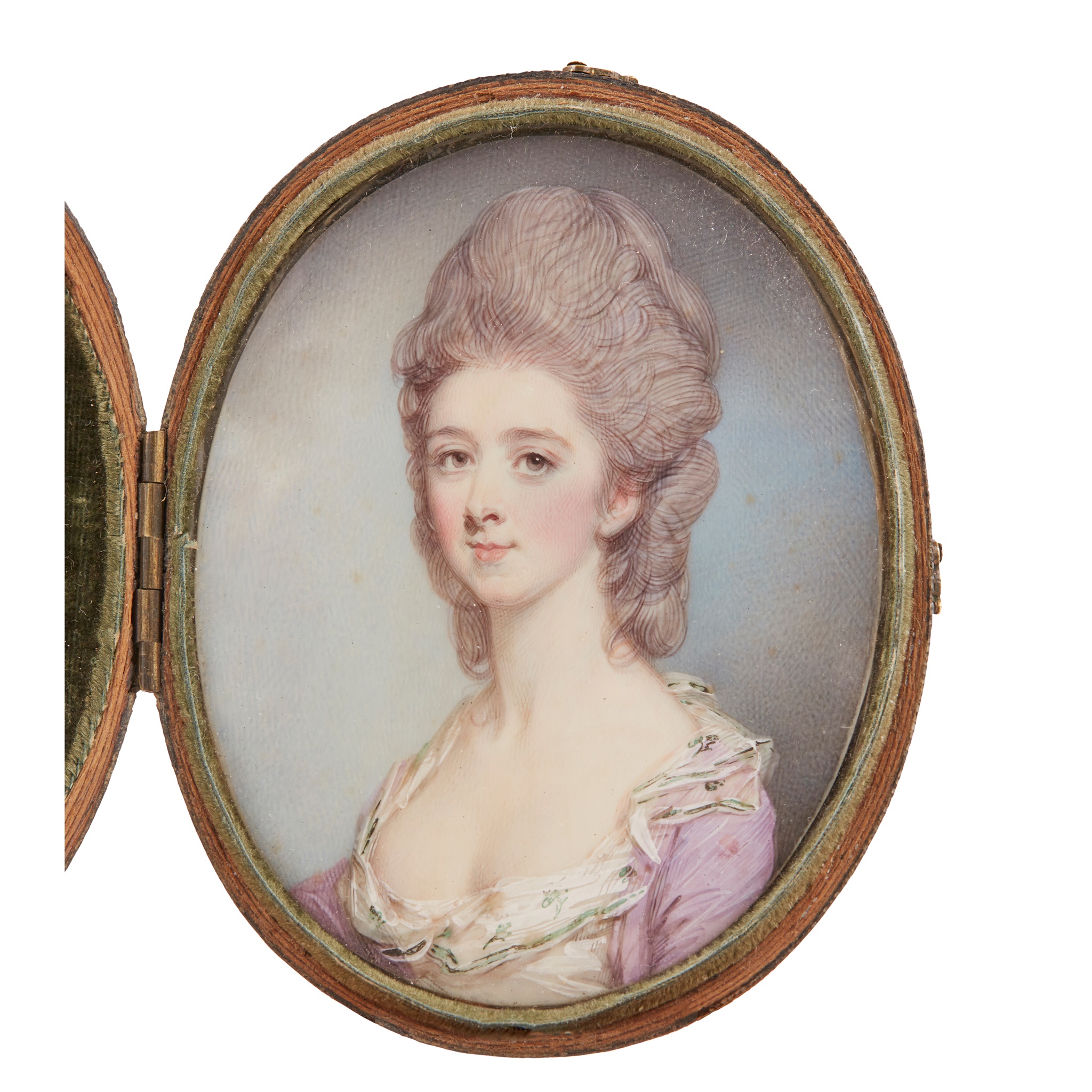 oval, painted in watercolour and body colour on ivory, the sitter a young lady with grey coiffured hair in a white flounced chemise with green edging and a pink jacket, in a period locket case with shagreen cover