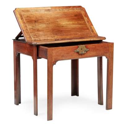 the hinged and ratchet adjusted banded top with re-entrant corners and a projecting bookrest, above a pull-out front opening to a compartmented interior, on straight moulded legs