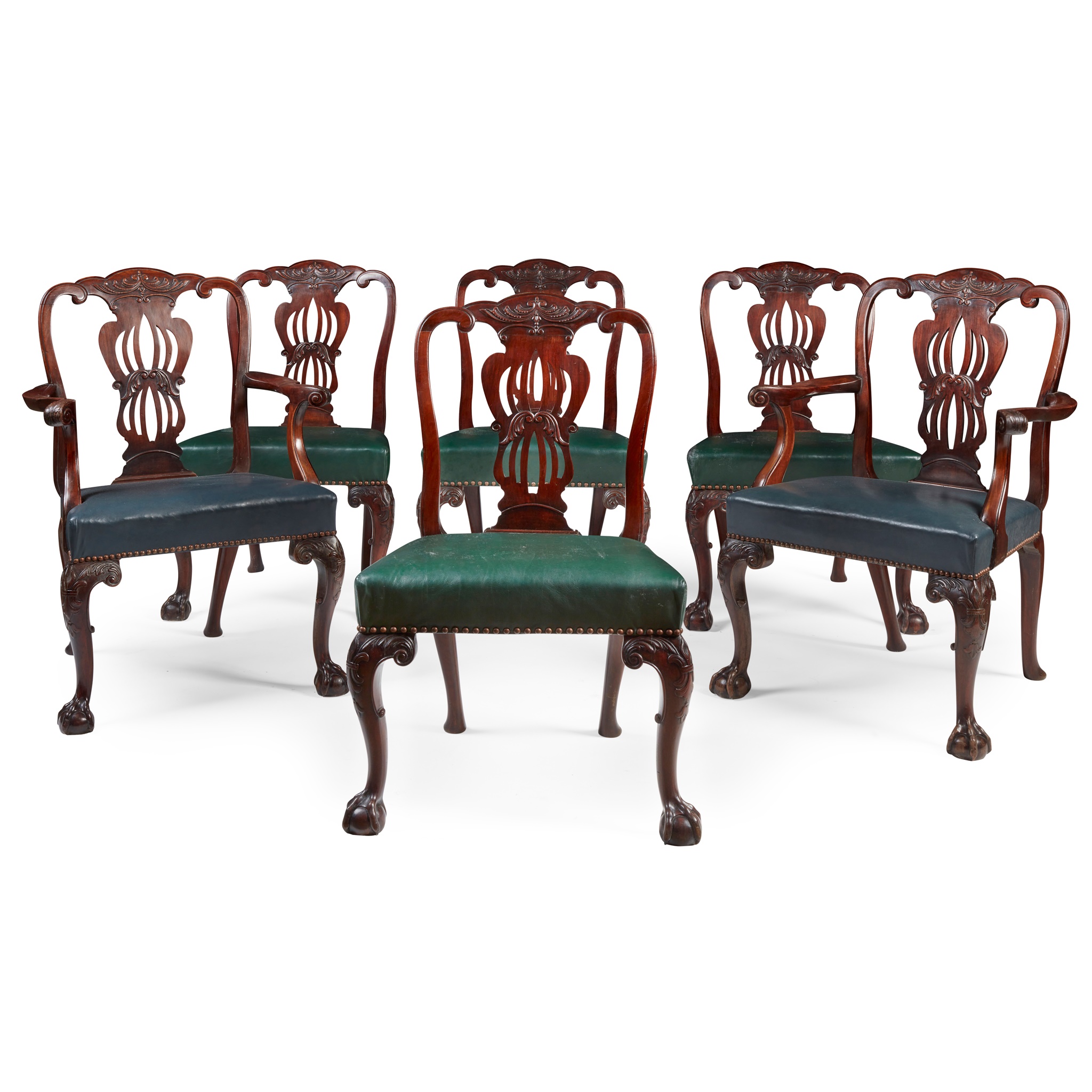 the top rails carved with scrolling acanthus above pierced vasiform splats, over green leather stuff-over seats with close nail trim, raised on acanthus and fleur-de-lis carved cabriole legs ending in claw and ball feet; to include a pair of armchairs and four side chairs