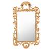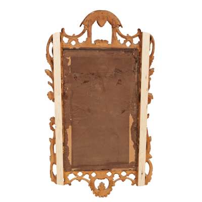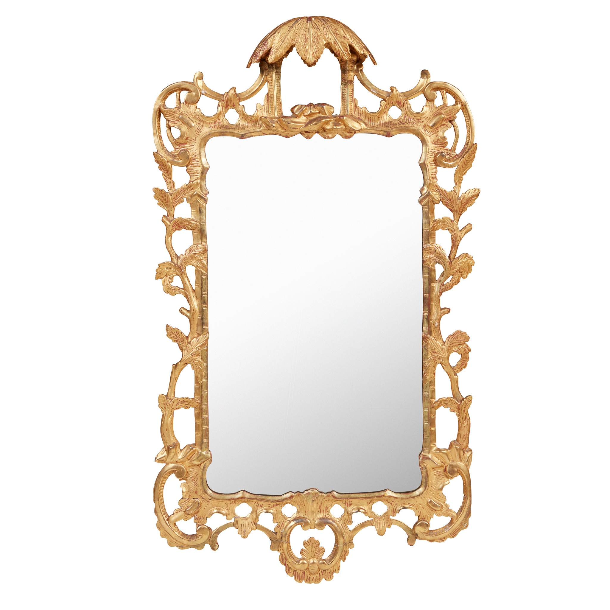 the rectangular mirror plate in a carved and pierced frame with C scrolls, twining branches, and rocaille, surmounted by a carved palm leaf roof pavilion cresting