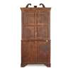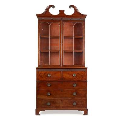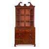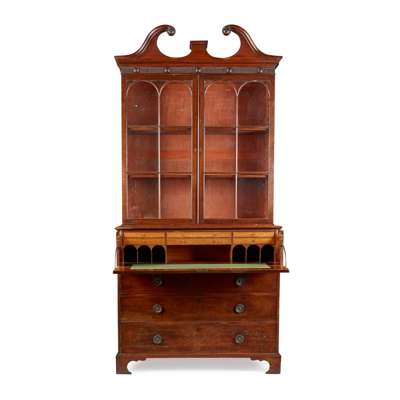 the moulded swan neck pediment above a fluted frieze marked with roundels, over a pair of arched astragal glazed doors enclosing adjustable shelves; the base with a matching frieze and secretaire drawer opening to a green leather writing surface, drawers and pigeon holes, over three further long drawers, raised on shaped bracket feet