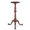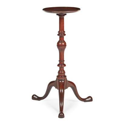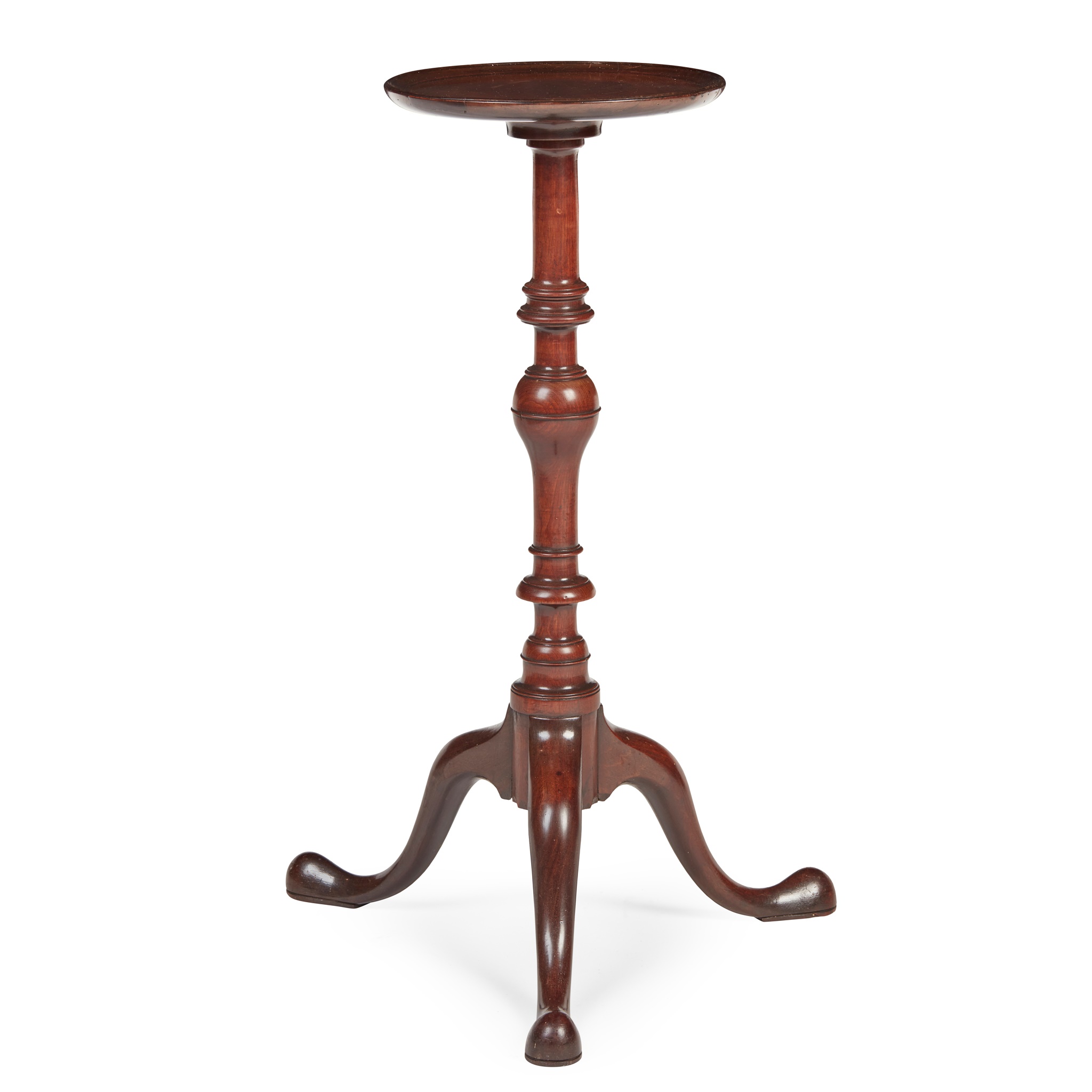 the circular dished top, raised on a ring-turned knopped column and tripod base with cabriole legs and pad feet